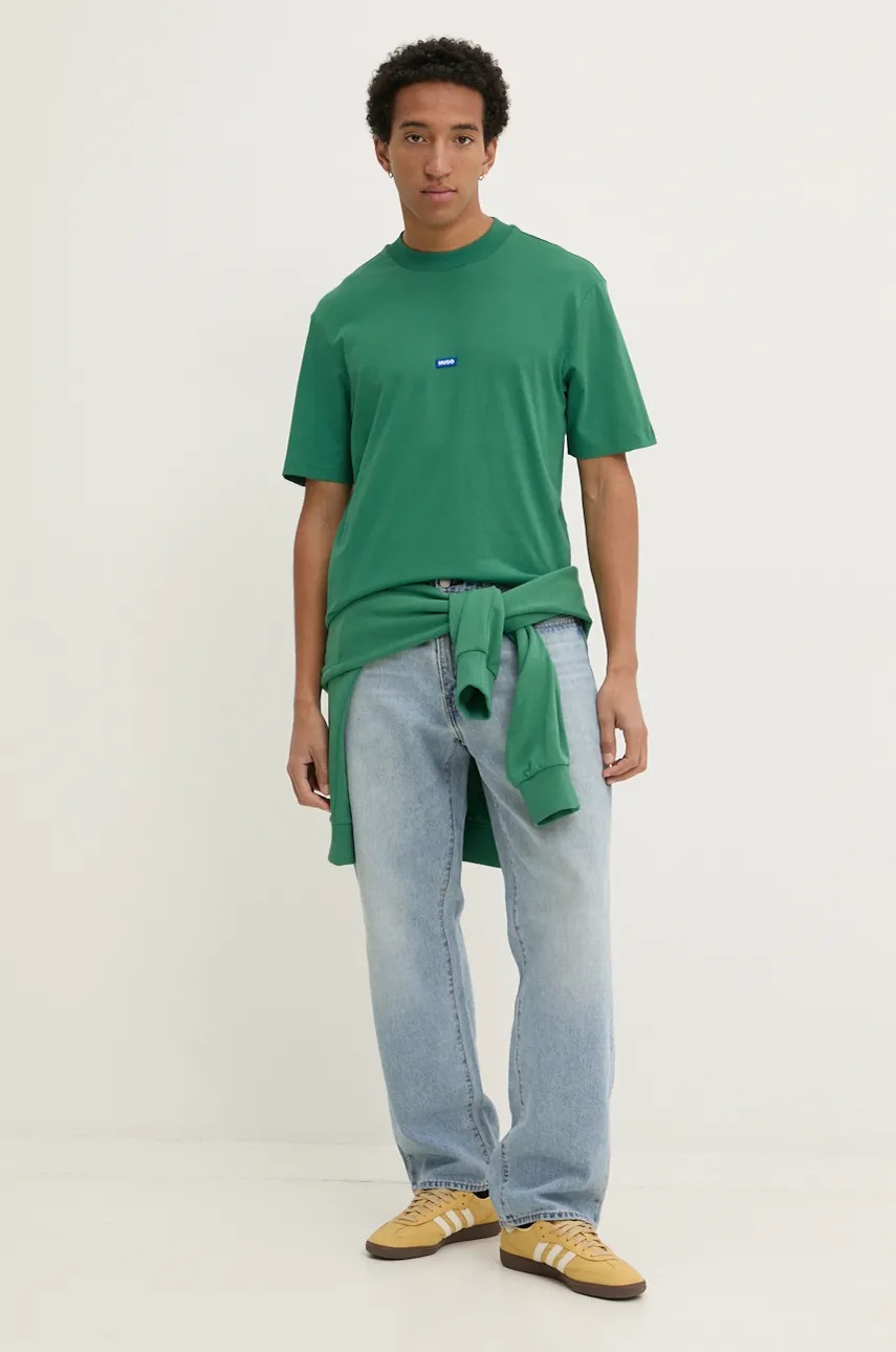 Хлопковая футболка Hugo Blue мужской цвет зелёный однотонный 4575866